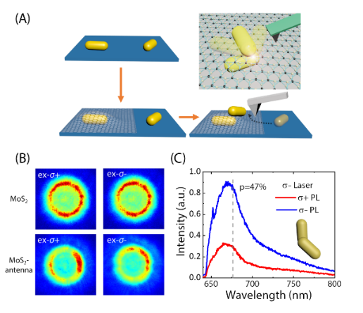 图1 (A) 手性天线制备过程示意图。(B) 荧光远场辐射角分布图。(C) 被天线调制的荧光谷偏振度。