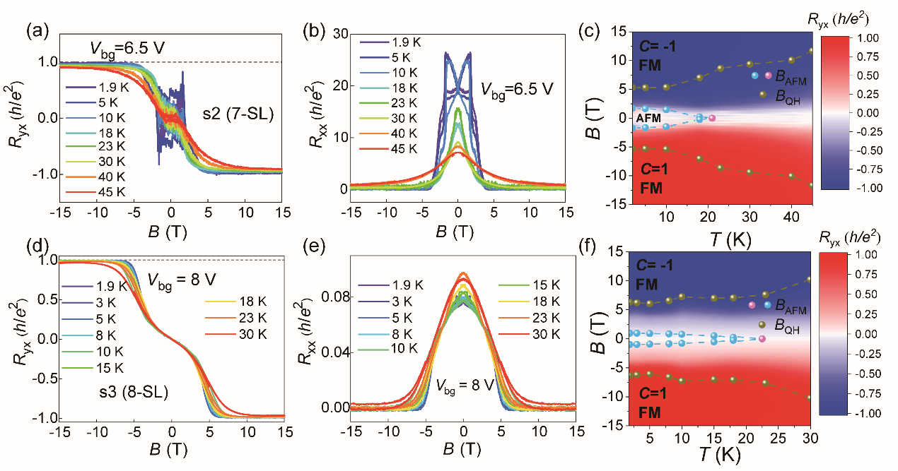 研究团队进一步研究了厚度对陈绝缘体态的影响。在7层和8层的器件中,通过施加一定的垂直磁场,观测到了值为1个量子电阻(h/e2)的霍尔平台和同时趋近于零的纵向电阻,也就是陈数为1的陈绝缘体态。更重要的是,7层器件中的量子化温度高达45 K (45 K时,霍尔平台超过90%的量子电阻,且纵向电阻小于霍尔电阻,见图2a,b);8层器件中的量子化温度也超过了30 K (30 K时,霍尔电阻为97%的量子电阻,且纵向电阻接近于零,见图2d,e),显著高于器件的反铁磁转变温度(奈尔温度,在器件中约22 K)。图2c,f所展示的相图清晰的表明了7层和8层的器件中陈绝缘体态随着温度变化的演变过程。