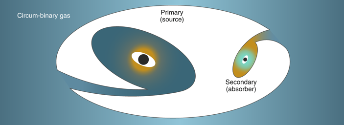 Figure: 主黑洞(Primary)和次黑洞(Secondary)吸积周围气体(Circum-binary gas)。次黑洞的吸积盘作为吸收体(absorber)吸收主黑洞这个光源(source)辐射的电磁波,从而受到一个等效的阻力。 Credit: AAS