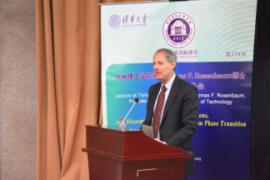 上午十点,由清华大学国际处主办、量子物质科学协同创新中心协办的“清华海外名师讲堂”第174讲暨量子物质科学协同创新中心“大师讲堂”第6讲在理学院报告厅举行。Rosenbaum教授为清华大学师生做了题为“Correlations, Fluctuations, and Disorder at Chromium’s Quantum Phase Transition”的专题学术报告,主要介绍了自己在金属Cr中的量子相变方面的研究成果。高等研究院副院长、中心成员翁征宇主持了报告会。