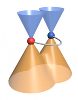 拓扑Weyl半金属的拓扑非平庸电子结构(橙色和蓝色锥形:体态的Weyl费米子。蓝色及红色小球:不同手性的Weyl点。灰色弧:不连续的拓扑表面费米弧)。 |