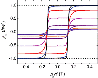 量子反常霍尔效应的实验数据图:不同的曲线显示在不同栅极电压下材料霍尔电阻ryx 随磁场的变化。 在一定的栅极电压范围内,零磁场的反常霍尔电阻数值达到量子电阻的数值h/e2。 |