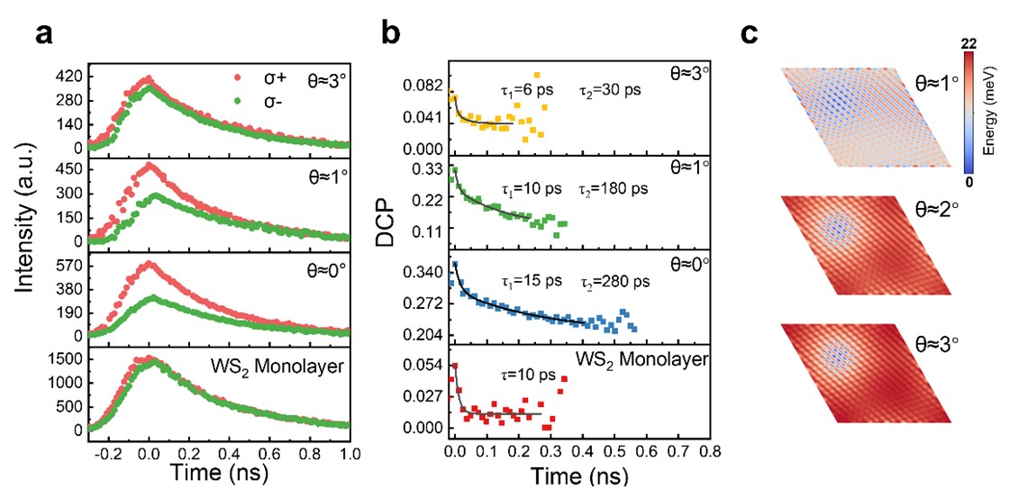 图2. 转角异质结中的层内激子谷动力学。(a) 不同扭转角下共极化和交叉极化PL的时间分辨测量 (T = 10 K)。绿色(红色)点表示交叉(共)极化的PL衰减。(b) 根据(a)计算得到的时间分辨DCP。实黑色线表示谷寿命的指数拟合。(c) 不同扭转角度下WS2层内的e-h交换能。