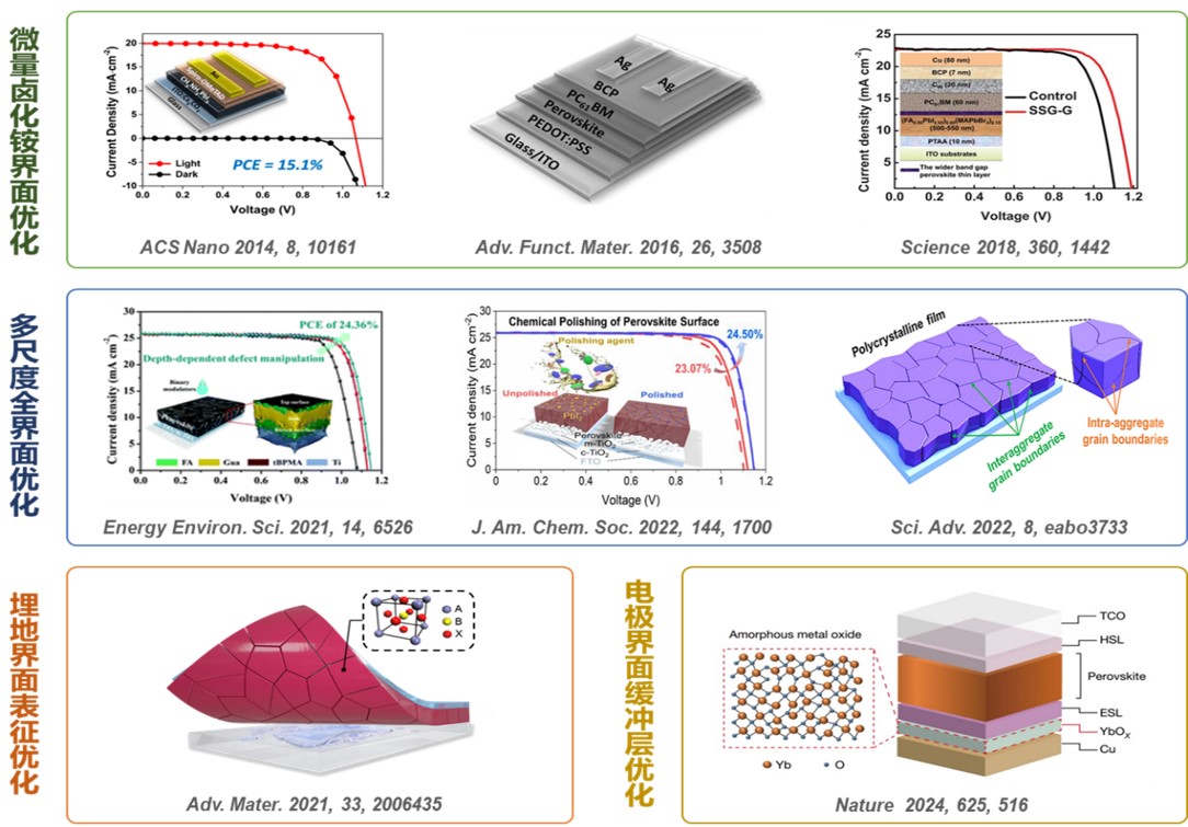 图1. 朱瑞教授等人在钙钛矿太阳能电池界面优化策略及表征方法方面的进展。
