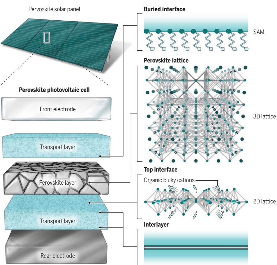 相比于其它多晶光伏材料,金属卤化物钙钛矿通常具有更好的“缺陷容忍”特性。对缺陷进行有效的调控处理,可进一步提升太阳能电池的效率和稳定性。钙钛矿薄膜上下表面存在大量未配位悬挂键或空位,其与相邻功能层薄膜(如空穴或电子传输层)形成的异质结界面是缺陷聚集、导致损失的主要区域之一。例如,钙钛矿与电子传输层界面处的能级失配是性能的主要损失来源,在三维钙钛矿薄膜表面构筑二维钙钛矿层被认为是一个有潜力的界面优化策略。此外,电子传输层与金属电极之间往往是离子迁移聚集严重的区域,进而导致的电极分解等问题将直接破坏钙钛矿电池结构稳定性。目前,不同界面缓冲层被引入到该界面以抑制离子迁移,更多的策略仍待进一步开发;处在钙钛矿薄膜底部的埋底界面因其难以被直接观测表征而更少被关注,埋底界面的孔洞、细碎晶粒、不可控应力等情况亦会严重影响电池性能。通过引入自组装单分子层(SAM)可实现对钙钛矿埋底界面的有效调控,其工作机理仍需深入探索。