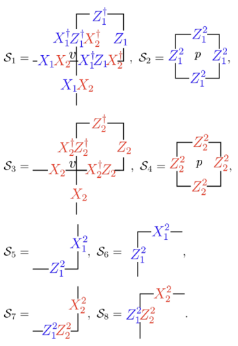 的量子比特。例如:第一个是色码(color code),它由图中所示模样的全都是X和全都是Z的两个稳定子构成。