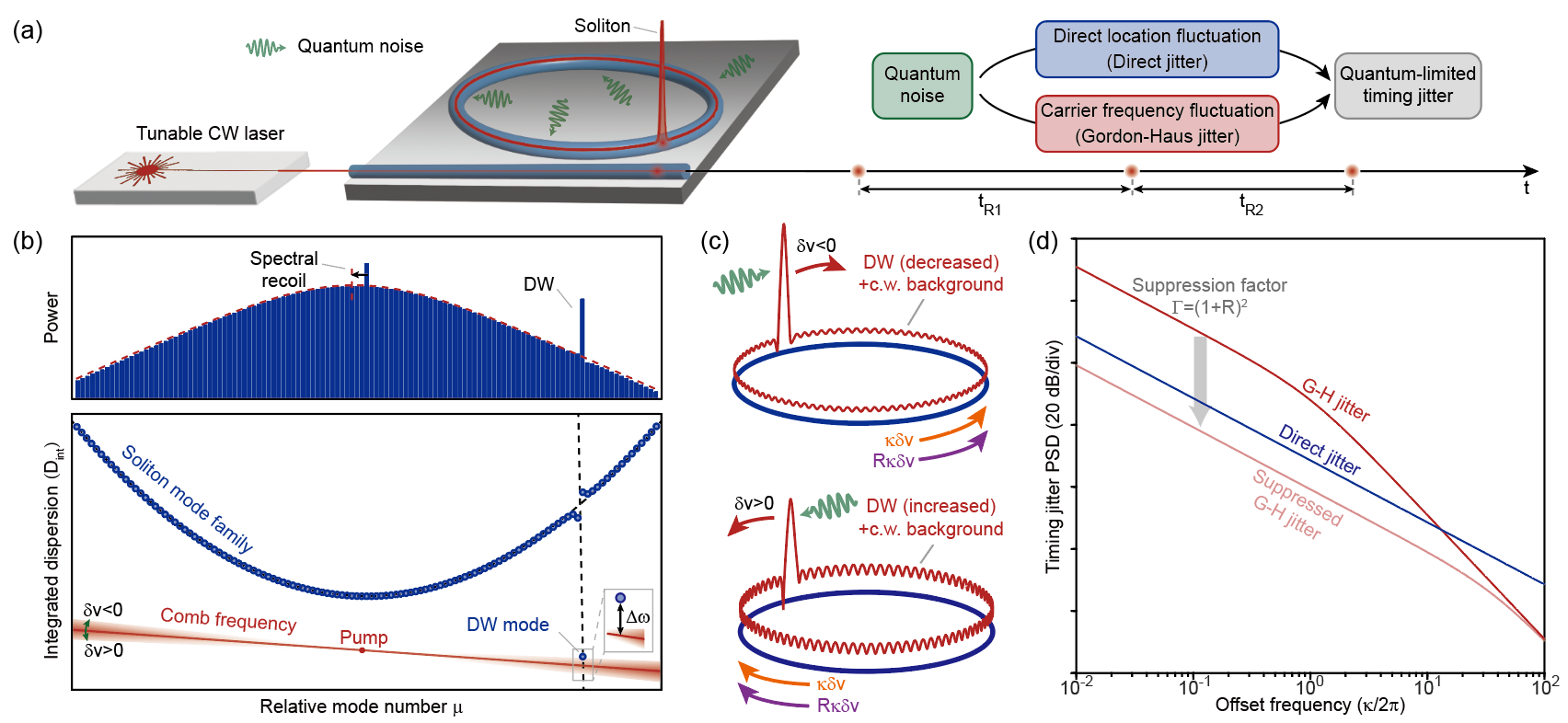 图1. (a) 孤子光梳量子定时抖动概念图。(b) 色散波抑制孤子光梳量子定时抖动频域图像。(c) 色散波抑制孤子光梳量子定时抖动时域图像。(d) Gordon-Haus抖动、直接抖动以及被抑制后的Gordon-Haus抖动功率谱密度。