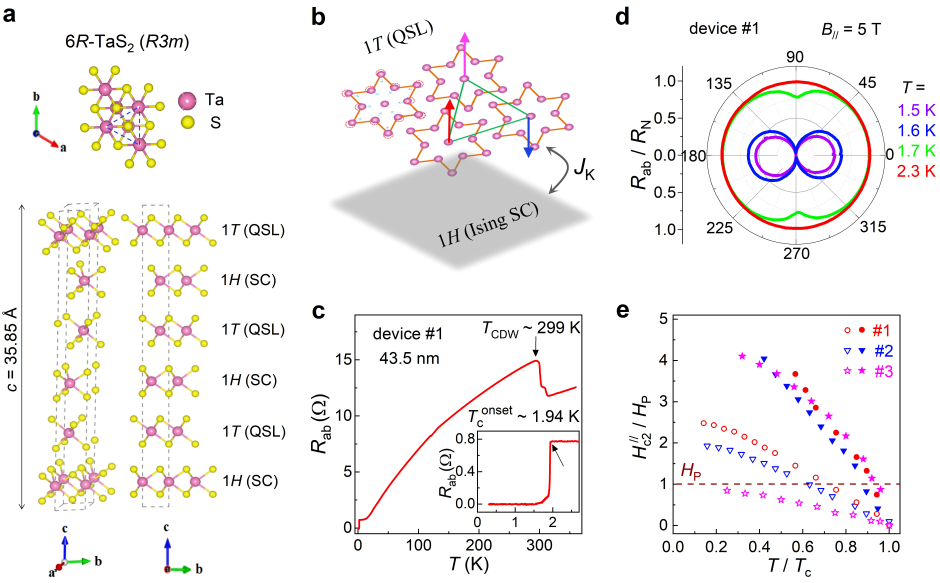 近日,北京大学物理学院量子材料科学中心、纳米器件物理与化学教育部重点实验室、北京量子信息科学研究院陈剑豪教授课题组与谢心澄院士等合作者通过构筑量子自旋液体/伊辛超导异质结低维量子系统,在中心对称破缺的天然异质结6R-TaS2(堆叠方式:1T-1H-1T-1H-1T-1H)中实现了高度交织的衍生关联物理。相关研究成果以“薄层6R-TaS2中向列相伊辛超导-隐藏磁性共存”(Nematic Ising superconductivity with hidden magnetism in few-layer 6R-TaS2)为题发表在期刊《自然•通讯》(Nature Communications)。