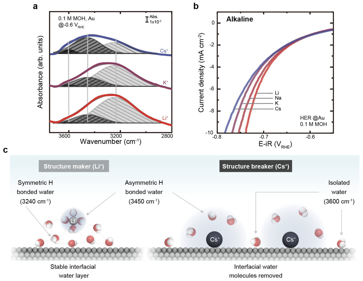 图2不同碱金属溶液下,Au电极SEIRAS中OH振动峰的分解:3240cm-1对应于对称氢键网络的水分子(ice-like water molecules),3450cm-1对应于非对称氢键网络的水分子(water molecules within the hydration shell)以及3600cm-1对应于弱氢键的水分子(isolated water molecules)(a);碱性环境下HER反应电流密度(b);锂离子与铯离子在电极界面处氢键网络的示意图(c)。