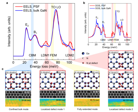 北京大学物理学院人工微结构和介观物理国家重点实验室王新强教授、北京大学电子显微镜实验室王涛高级工程师与美国橡树岭国家实验室Lucas Lindsay教授合作,实现了对GaN棱柱状堆垛层错(PSF)中缺陷局域声子的原子尺度观测。相关研究成果以“GaN中缺陷引起的局域振动的原子尺度可视化”(Atomic-scale visualization of defect-induced localized vibrations in GaN)为题,于2024年10月20日发表在《自然·通讯》(Nature Communications)。