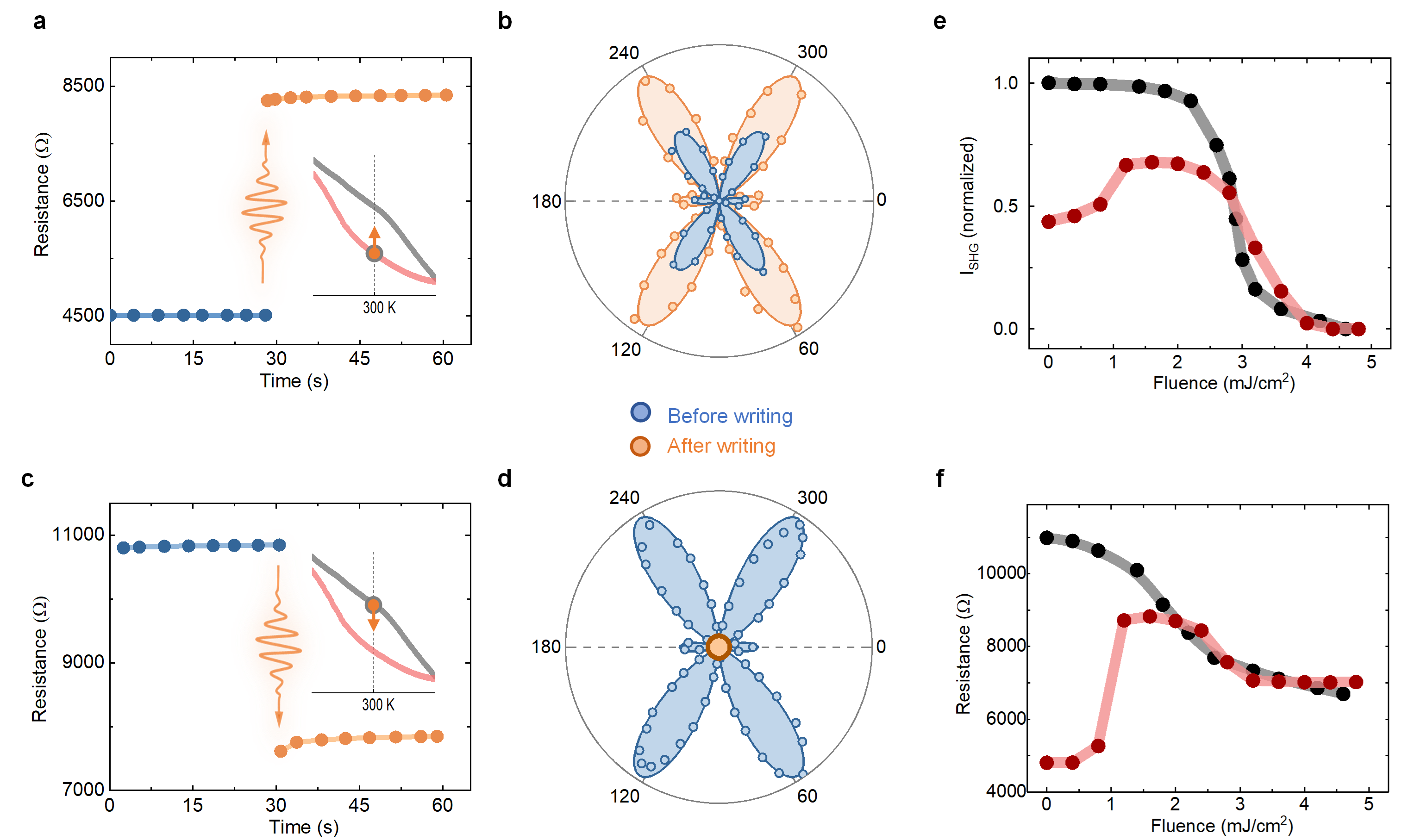 室温下结合飞秒800 nm光激发,平衡态二次谐波(SHG)和电学测量,研究团队发现通过单个写入脉冲,可增强或抑制纳米级厚度EuTe4样品的SHG强度及电阻,并且在弱和强激发区间(临界通量FcR~ 6.8 mJ/cm2)有明显区别。在弱激发区间(图2),可诱导该体系热回滞区间内物性的非易失变化,较弱脉冲令处于降温支路体系的SHG和电阻(1.5 mJ/cm2,图2a,b)同步增强,而抑制处于升温支路体系的SHG和电阻则需要较强通量的写入脉冲(2.5 mJ/cm2,图2c,d),此后通过热退火方式可令体系恢复至初始态。在强激发区间(图3),创造了全新亚稳态并实现全光可逆操控,单个强脉冲令SHG信号消失但电阻增加三个量级;随后上千个中等通量(4-5 mJ/cm2)的脉冲序重新诱导出SHG信号不同于初始态的极化态,电阻恢复至初始态水平。拟合得知此时的二阶非线性极化张量元caaa显著增加。