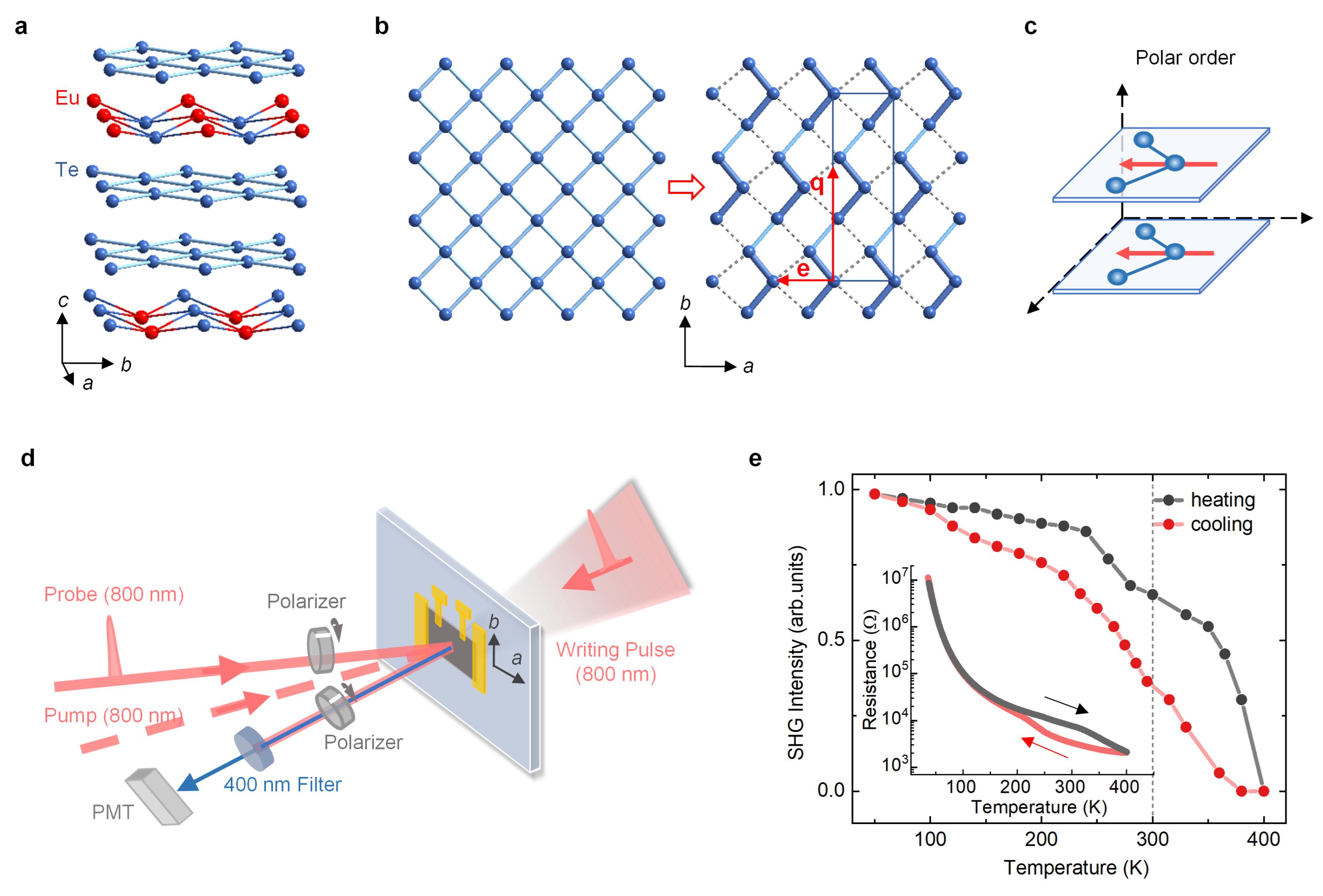 图1. a. EuTe4的平均晶格结构。由平面Te层和波纹状Eu-Te层交替构成。b.方形Te层的Peierls不稳定性导致Te三聚体的形成。CDW波矢q沿b轴,与极化矢量e垂直。c.极化序的堆叠顺序示意图,其中相邻Te层中的三聚体平行同相排列。d.实验示意图。e.初始态样品的变温SHG强度曲线,与插图中电阻曲线的热回滞行为一致。