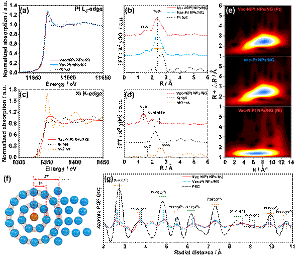性能测试表明,该混合应变结构有效提升了铂颗粒抗一氧化碳毒化性能和甲醇耐受性能但不利于ORR活性提升。针对这一问题,研究人员引入微量镍对含缺陷的铂颗粒进行合金化,结合XAFS和PDF结果与性能测试结果表明,微量镍的合金化在不影响上述混合应变结构的情况下引入Ni与Pt之间的电子协同效应,从而实现在提升ORR性能的同时保留了抗一氧化碳毒化性能和甲醇耐受性能。