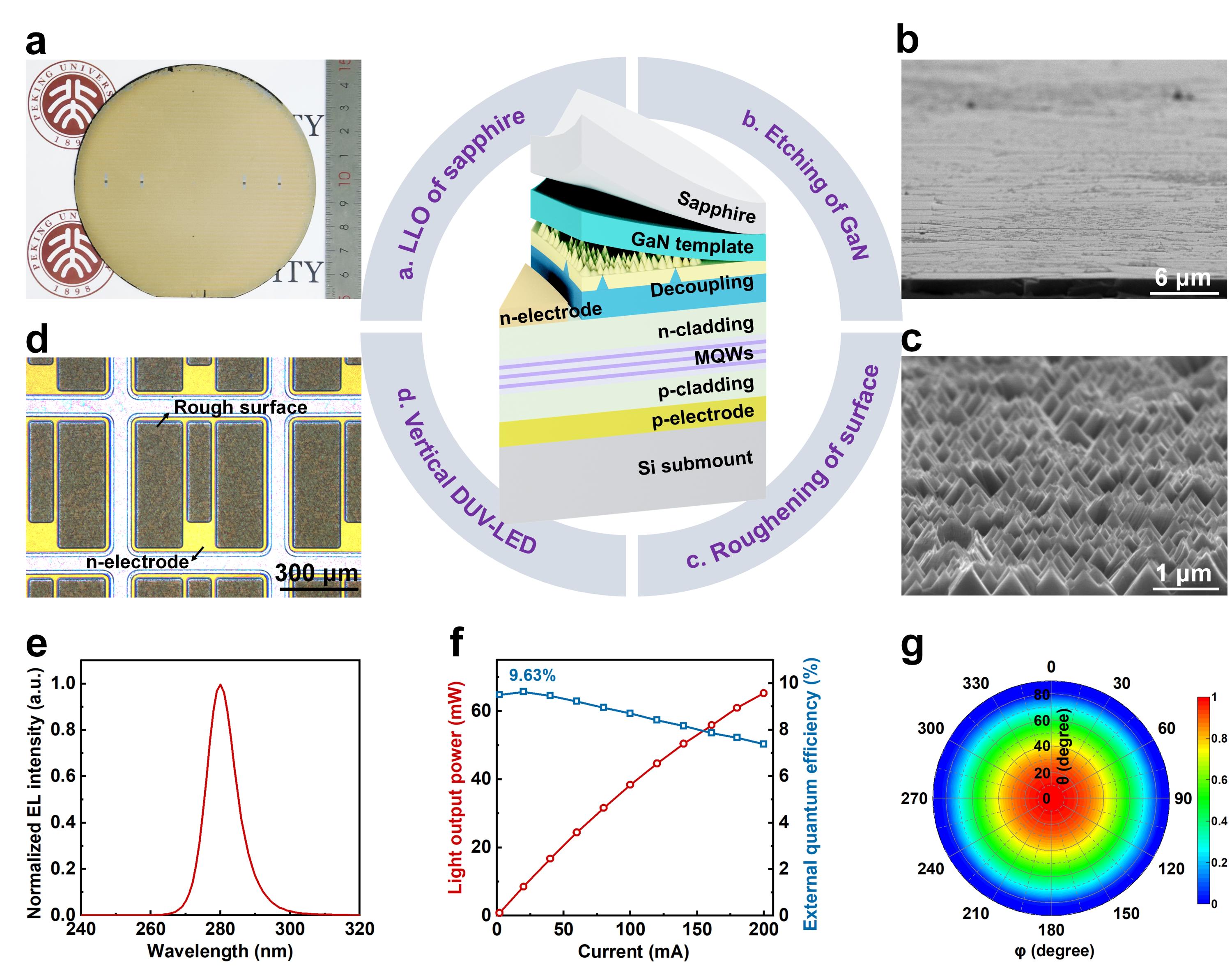 图a:4英寸深紫外LED外延薄膜的无损伤激光剥离,图b:GaN模板刻蚀后SEM图像,图c:深紫外LED外延薄膜表面糙化SEM图像,图d:垂直注入深紫外LED光镜图像,图e:器件电致发光光谱,图f:器件出光功率及外量子效率,图g:器件出光远场分布。