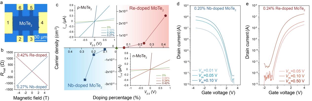 图2.对掺杂的二维半导体碲化钼薄膜进行霍尔电学表征和晶体管性能测试。