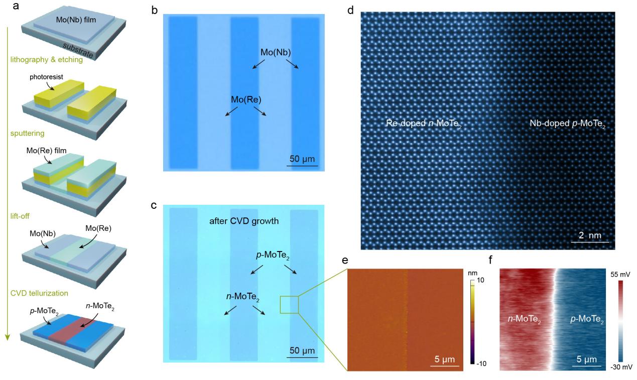 基于上述研究背景,叶堉课题组与合作者在前期二维碲化钼薄膜相变与可控制备的基础上,提出二维半导体碲化钼(MoTe2)薄膜的共溅射掺杂技术。利用双靶位共溅射方式,在高温碲化之前向钼膜中精准控制掺入一定量的杂质元素铌(用于空穴掺杂)或铼(用于电子掺杂)。然后,通过化学气相沉积(CVD)碲化Mo膜前驱体从而获得掺杂的少层MoTe2膜(图1 a)。利用该方法可以制备大面积、晶圆尺寸的掺杂二维半导体MoTe2薄膜(图1 b),展示其大规模应用的潜力。与此同时,对掺杂后的二维MoTe2薄膜进行扫描隧道显微镜微分电导谱(STS)表征(图1 c)。通过STS表征结果可清晰观察到MoTe2半导体随着掺杂元素的改变,其费米能级(EF)位置明显移动。对于铌(Nb)掺杂的情况,EF更接近价带顶,表现出p型半导体特征。而铼(Re)元素的掺杂结果则相反,其费米能级更靠近导带底。考虑到样品之间的唯一区别是在Mo膜前驱体中引入了不同的杂质原子,并且它们是在相同的条件下制备和测量的,因此可以排除分子吸附或环境因素对费米能级位置的影响。STS的表征结果直观地展现出掺杂剂对二维半导体MoTe2的费米能级位置的影响,随后研究人员对掺杂的MoTe2半导体进行电学特性的表征分析。