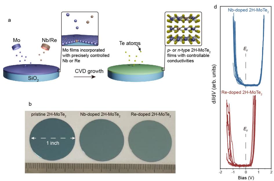 图1.利用共溅射掺杂技术制备晶圆级掺杂二维碲化钼薄膜,并用扫描隧道显微镜谱对其半导体能带结构进行表征分析。