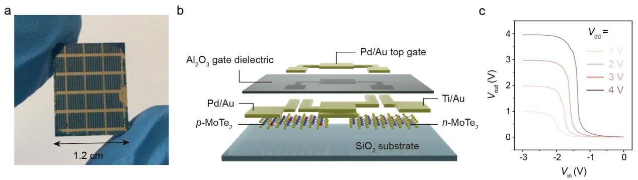 图4.大面积制备基于二维掺杂碲化钼半导体的互补型反相器电路阵列及其性能测试。