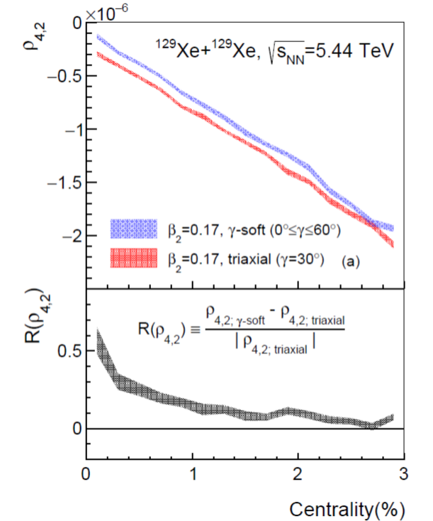 在原子核领域,形状相变用以解释某些同位素或同中子素链在其低能结构(核子关联及集体运动模式等)和性质的演化行为,它与核的对称性紧密相关,对其深入的了解可加深我们对原子核基本性质的认识。以往研究表明,Xe 同位素链会在128-130Xe 附近发生二级形状相变,其结构由 ϒ 软转子过渡到球形振子。在该文章中,北京大学团队与合作者首次提出利用LHC能区的Xe+Xe碰撞来探究Xe同位素链的形状相变。