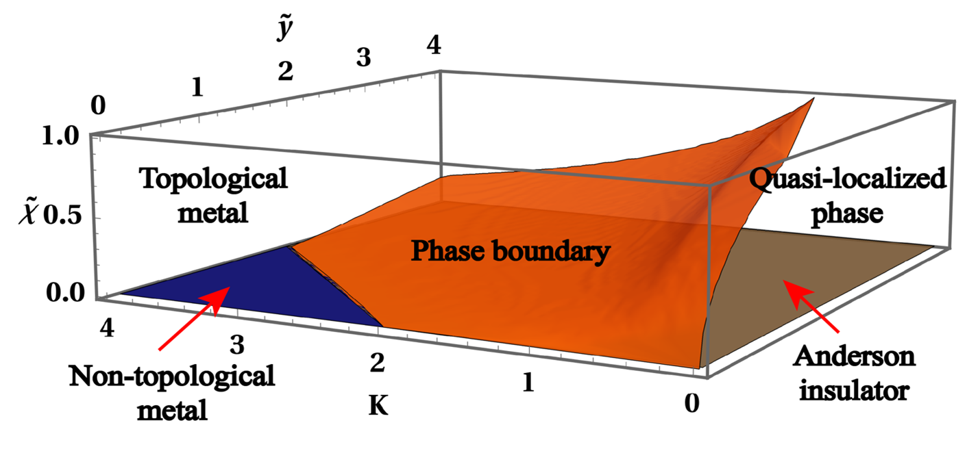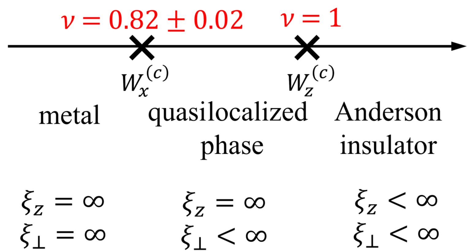输运现象是物理学的核心问题。过去几十年来,无序拓扑系统的输运行为得到了广泛研究。然而,能带拓扑在安德森转变中的作用一直难以捉摸。人们普遍认为波函数的局域化-非局域化相变在所有空间方向上是同时发生的。与这一传统观念相反的是,进藤龙一课题组博士研究生肖振宇等人在2023年的一个数值研究(Phys. Rev. Lett. 131, 056301 (2023))中发现,在存在一维弱能带拓扑的情况下,金属-绝缘体相变会分为两步进行,其中一种被称为“准局域化相”的新物相会在相图上普遍出现于金属相与安德森局域化相之间(见图1)。在准局域化相中,沿着一维弱拓扑方向(后称为“拓扑方向”)的指数局域长度是发散的,而沿其他方向的局域长度则是一个有限值。肖振宇等人还明确指出,金属相与准局域化相之间的相变属于与同一手征对称类中不具有弱拓扑的安德森转变不同的普适类。这些数值发现清楚地表明了一个事实:一维弱拓扑完全改变了手征对称类中安德森相变的性质,甚至在金属和绝缘体之间产生了新的物相。
