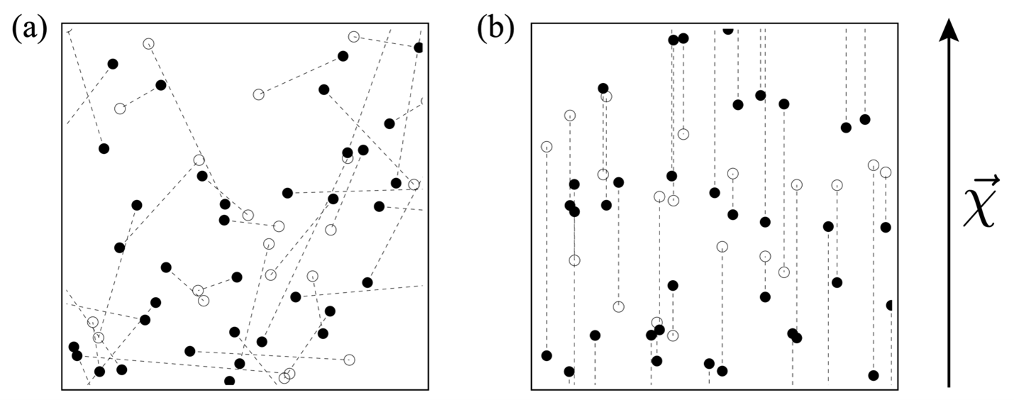 图2,该示意图展示了在没有一维弱拓扑(a)和有一维弱拓扑(b)的手征对称系统中,涡旋-反涡旋对的空间增殖情况。由虚线连接的黑色实心圆和白色空心圆表示一个涡旋-反涡旋对。向量chi标记了一维弱拓扑的方向。