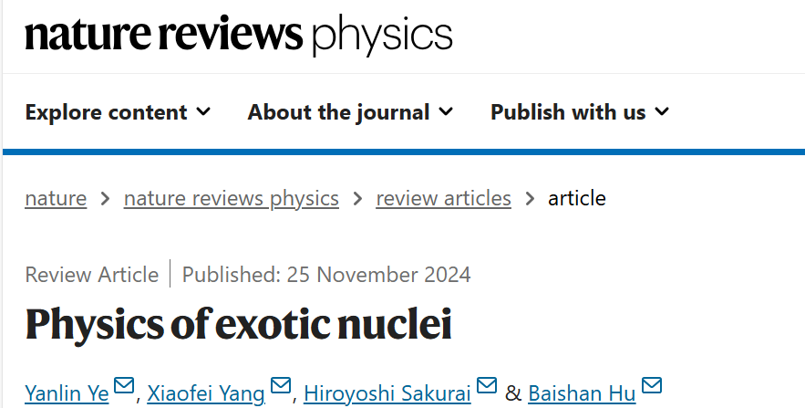近日,应《自然综述·物理》(Nature Reviews Physics)杂志邀请,北京大学物理学院、核物理与核技术国家重点实验室叶沿林教授和杨晓菲教授联合日本理化学研究所仁科加速器科学研究中心Hiroyoshi Sakurai教授和美国橡树岭国家实验室胡柏山博士后研究员,共同发表了题为“奇特原子核物理”(Physics of exotic nuclei)的综述文章。