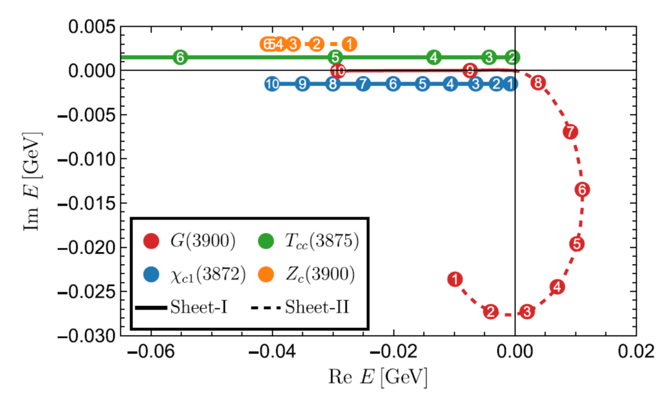 图二:χc1(3872)、Tcc(3875)、Zc(3900)和G(3900)极点位置随相互作用参数的变化。