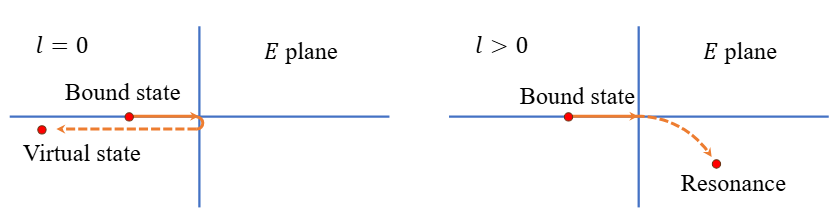 图一:相互作用减弱时束缚态变为虚态(S波,左)或共振态(P波,右边)