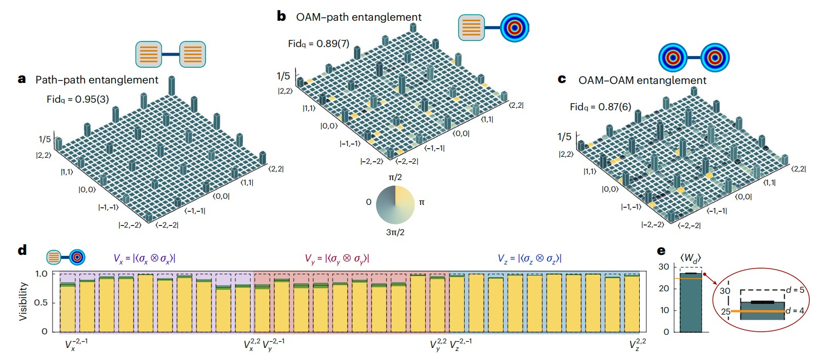 图3. 高维纠缠测量与验证。(a)重构的路径-路径纠缠态密度矩阵;(b)重构的路径-OAM纠缠态密度矩阵;(c)重构的OAM-OAM纠缠态密度矩阵;(d)-(e)五维纠缠见证测量的实验结果。