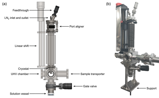 近日,北京大学物理学院量子材料科学中心江颖教授团队自主研发出一种新型冷冻溶液样品制备装置,该装置能够在超高真空环境中将溶液以玻璃态形式直接转移到衬底上,以获得洁净的高质量冷冻溶液样品。通过将该装置与高分辨扫描探针技术有机融合,有望构建“冷冻扫描探针显微系统”,实现对冷冻溶液的非侵扰性原子级分辨率探测。相关研究成果以“一种适用于超高真空实验的冷冻溶液样品制备装置”(An apparatus for preparing frozen solution samples in ultrahigh vacuum experiments)为题,于2025年3月28日发表在仪器科学领域国际顶级期刊《科学仪器评论》(Review of Scientific Instruments)上。