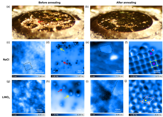 图3 (a-b)退火前(a)后(b)转移冷冻NaCl溶液的Au(111)表面实拍图。(c-f)退火前(c-d)后(e-f)冷冻NaCl溶液的qPlus-AFM扫描图像。(g-j)退火前(g-h)后(i-j)冷冻LiNO3溶液的qPlus-AFM扫描图像。