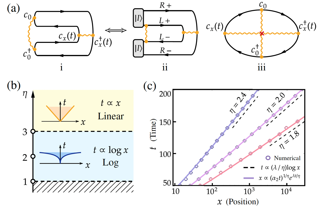 此外,为计算表征算符弥散的交错时序关联函数(out-of-time-order correlation function, OTOC)的光锥结构,课题组发展了双希尔伯特空间方法 [5],将计算交错时序关联函数SK有效场论的四分支Keldysh围道等价为双倍希尔伯特空间中的二分支Keldysh围道【图2. (a)】。这一等价简化了SK有效场论和鞍点展开技术,从而得到了OTOC的动力学方程,以及其涌现的光锥结构相图【图2. (b, c)】。相图表明,当长程相互作用衰减幂次大于3时系统算符弥散的光锥结构依然为线性,与Lieb-Robinson定理一致;而当幂次小于3时系统算符弥散显著加快,其光锥结构表现为对数型,该结果与大-N极限下的数值结果一致。