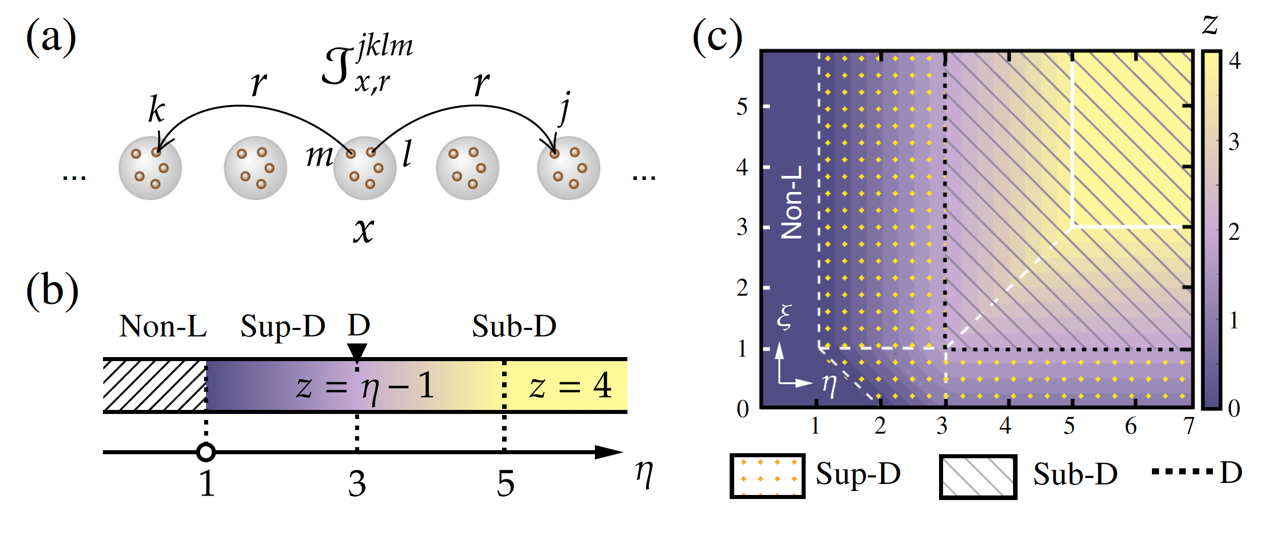Sachdev-Ye-Kitaev (SYK) 模型得益于大-N特性成为精确求解强关联量子多体系统的成功理论 [4]。受该模型启发,课题组扩展了SYK模型,将质心守恒和幂律长程相互作用引入,构造了一类布朗型随机耦合的SYK模型【图1. (a)】。系统具有粒子数守恒,因此可以研究粒子数密度输运的流体力学行为。利用Schwinger-Keldysh (SK) 有效场论方法和鞍点展开技术,他们解析计算了系统的流体动力学模式,得到了流体力学模式相图【图1. (b)】。计算结果显示,体系的动力学因子z在一定范围随着长程相互作用衰减的幂律连续变化,依次呈现超扩散、扩散和亚扩散行为。当长程相互作用衰减足够快时,动力学因子饱和于z=4的亚扩散行为,退回到局域相互作用情形。
