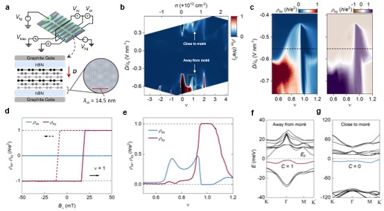 图1(a)器件光显照片和结构示意图。(b)零磁场下的纵向电阻随着莫尔填充因子(v)和电位移场(D)的变化。(c-e)v= 1处的陈绝缘体和量子反常霍尔效应。(f-g)理论计算的能带图。