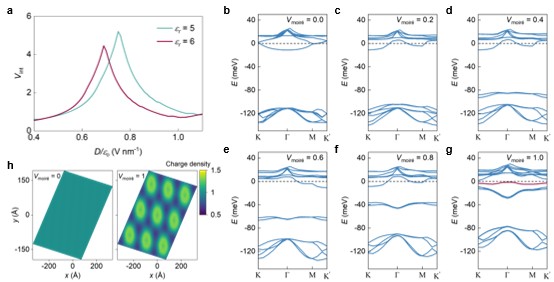 图4(a)计算的有效相互作用强度随着电位移场的变化。(b-g)施加不同莫尔势计算的能带图。(h)实空间的电荷密度分布计算。左图:莫尔势设置为0;右图:莫尔势设置为1。