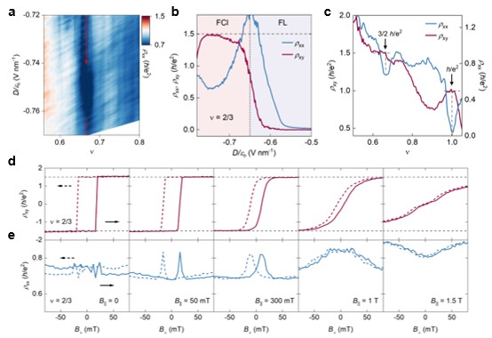 图2(a)分数填充区域纵向电阻随着填充因子和电位移场的变化。(b)2/3填充处纵向电阻和霍尔电阻的电位移场依赖关系。(c)纵向电阻和霍尔电阻随着填充因子的变化。(d-e)分数量子反常霍尔效应的面内磁场依赖关系。