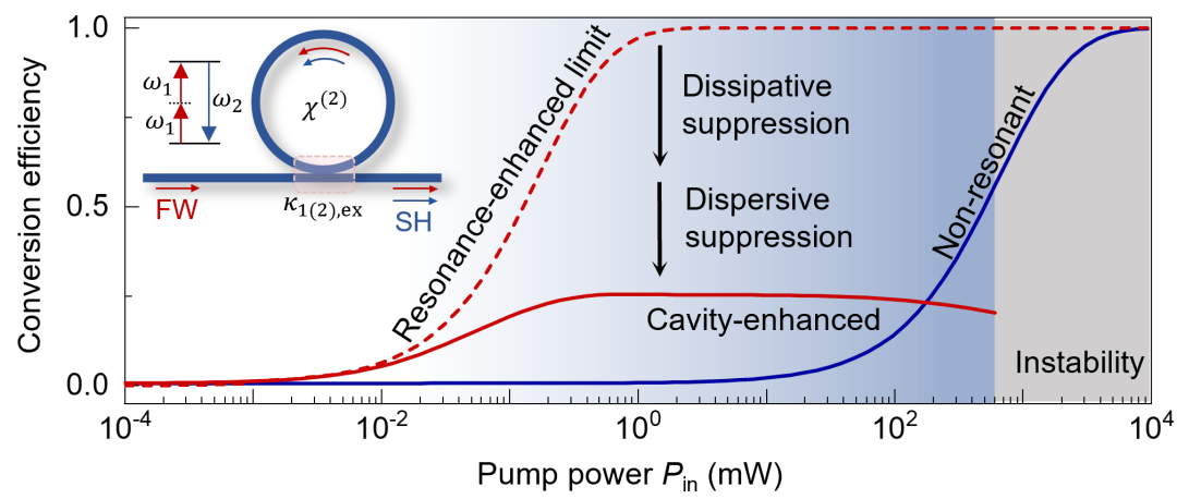 非线性频率转换是实现不同频段光信号之间高效互联的关键过程,广泛应用于光通讯、光谱学和量子信息等领域。相较于传统块状晶体材料体系,光学微腔凭借优异的光场时空局域特性,不仅能实现低功耗高效频率转换,还兼具微型化和可扩展的优势。然而,由于耗散效应和其它非线性效应的竞争,微腔非线性频率转换效率通常被限制在30%左右;进一步提高泵浦光功率不仅无法提升效率,反而会导致效率下降和系统失稳(如图1)。针对这一关键挑战,课题组建立了完整描述微腔非线性频率转换过程的理论模型,揭示了非线性色散和耗散效应如何抑制转换效率。理论上,课题组首次发现绝对转换效率极限的关键因子M,其完全由微腔工艺和材料特性决定;还建立了严格的非线性临界耦合条件,为突破现有效率瓶颈提供了理论指导。