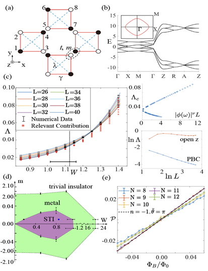 图 2. (a) 紧束缚晶格模型。(b) 晶格模型在干净极限下的能带结构(此时为节线半金属)。(c) 归一化局域化长度的计算。(d)相图,STI代表内禀统计拓扑绝缘体。(e)通过精确对角化方法计算磁电响应。