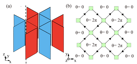 图 1. (a) 平均C4T对称性保护的拓扑晶体。(b)图(a)所示拓扑晶体的轴子角分布和表面态