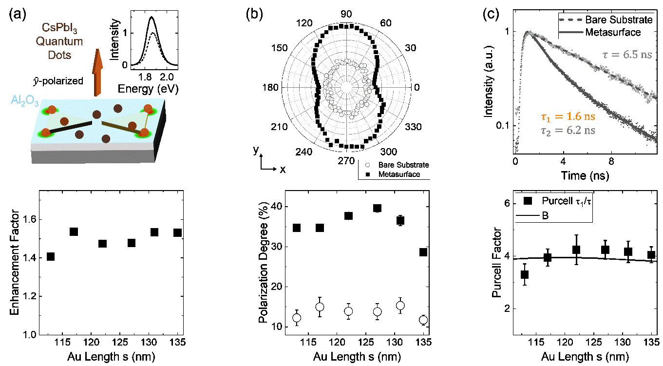 图3 等离激元超表面对CsPbI3量子点的鲁棒增益。(a)超表面-量子点耦合器件的示意图,荧光光谱(实线为超表面结果,虚线为衬底结果)以及荧光强度增益随结构大小参数的变化。(b)角分辨光谱(实心点为超表面结果,空心点为衬底结果)以及偏振度随结构参数的变化。(c)时间分辨光谱(实线为超表面结果,虚线为衬底结果)以及Purcell增益系数随结构参数的变化。可以看到荧光强度、偏振度和辐射速率的增益均具备鲁棒性。