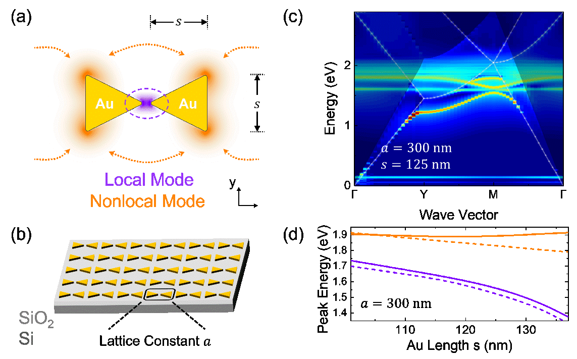图1 等离激元超表面的拓扑带隙和鲁棒共振能量。(a)等离激元纳腔的局域和非局域模式。(b)等离激元超表面结构,a是晶格常数。(c)小晶格常数超表面的能带。由于光子晶体能带和等离激元模式发生了强耦合,导致拓扑光子带隙被打开,出现反交叉现象。(d)等离激元模式的共振能量随结构参数的变化。与单个等离激元纳腔(虚线)相比,超表面的非局域模式(橙色实线)具有鲁棒的共振能量。