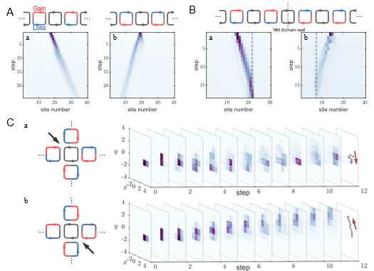 图2. 一维及二维非互易耦合与漏斗态的实验演示。(A) x轴非互易耦合演化结果。(a) 正方向、(b) 负方向。(B) 入射脉冲位于非厄米畴壁负侧(a)、正侧(b)时的拓扑漏斗态演化。(C) 入射脉冲位于漏斗左上方时的漏斗态示意图(右为实验结果),入射脉冲位于漏斗右下方时的漏斗态示意图(右为实验结果)。