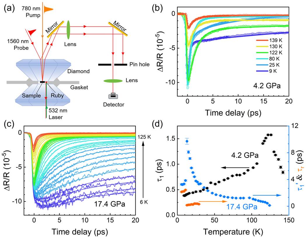 图1原位低温、高压超快泵浦探测光路示意图以及La4Ni3O10在两个代表性压力下的超快动力学响应随温度的变化