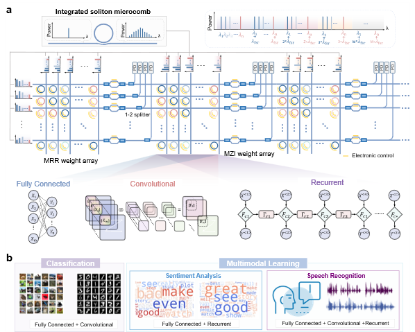 北京大学物理学院、纳光电子前沿科学中心、人工微结构和介观物理全国重点实验室“极端光学团队”胡小永教授、杨起帆研究员和龚旗煌院士与合作者在可重构多功能集成光子芯片研究中取得重要进展:提出一种创新的算法-硬件协同设计架构,该架构融合了交叉波导耦合的微环谐振器核心计算单元与光频梳光源,支持全连接神经网络、卷积神经网络和门控循环神经网络的原位切换,实验演示了图像识别、情感分析与语音识别等多模态信息处理任务,展示出强大的计算灵活性与任务适应性。该方案为实现多模型原位切换、兼顾处理静态与动态任务的集成光子芯片提供了新范式,为芯片级光子信息的高效多任务处理提供了新方案。2025年8月18日,相关研究成果以“可重构多功能集成光子芯片”(Reconfigurable Versatile Integrated Photonic Computing Chip)为题,在线发表于《光:快讯》(eLight)。