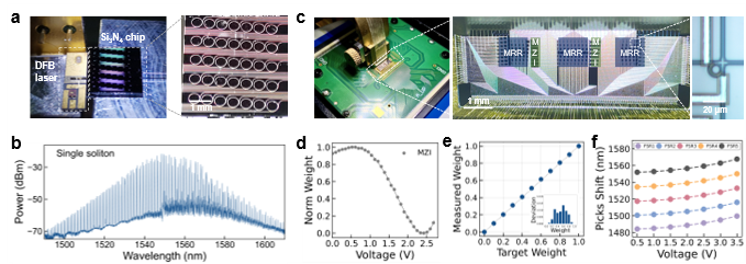 图2:(a) DFB激光器集成的氮化硅平台微腔;(b) 单孤子光频梳光谱;(c) 基于SOI平台制备并封装的计算芯片;(d) MZI单元器件的电调性能表征;(e) MRR单元器件调控权重精度;(f) MRR 单元器件的超宽带电调性能表征