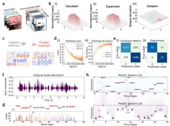 图3:(a) 图像识别任务示意图;(b) 卷积操作的理论和实验数据对比;(c) 情感分析任务示意图;(d) IMDB数据集训练损失和准确率曲线图;(e) IMDB数据集理论和实验混淆矩阵;(f) LJ-speech数据集样本待推测音频;(g) LJ-speech数据集样本推测文本;(h) LJ-speech数据集样本前30个时间步推理效果
