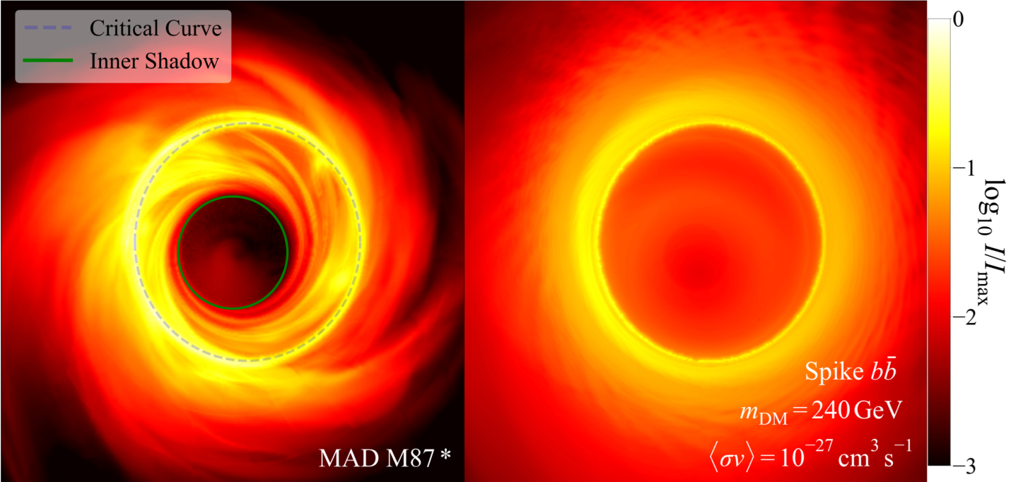 图2:M87* 的数值模拟。左图为仅含吸积流的情况,中心阴影边界清晰(绿色曲线标出);右图为考虑暗物质湮灭辐射时的结果,中心阴影被明显填亮。