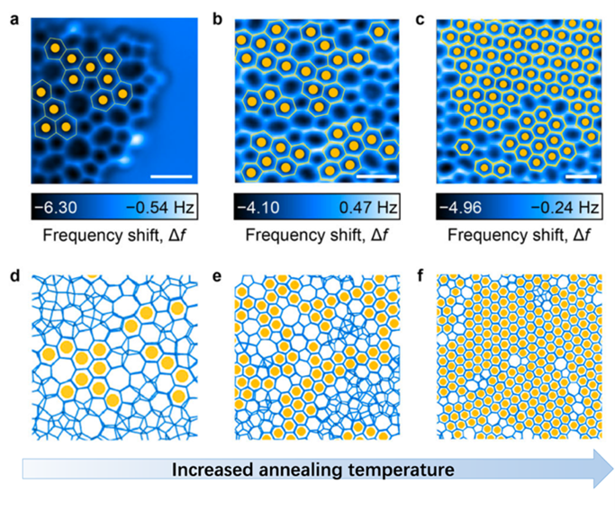 图1. 原子尺度观测二维冰的无临界核结晶过程,随着退火温度升高,黄点标注的六元环晶体结构经历从枝状到岛状的结构演化。a-c. 原子力显微镜成像图; d-f. 分子动力学模拟结果。