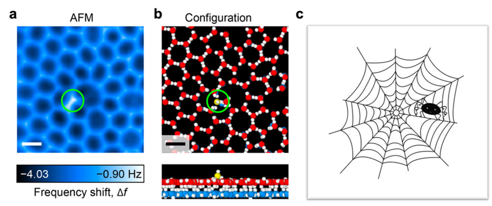 图2. 表面吸附分子诱导的二维晶化机制。a-b. 二维冰表面吸附分子的(a)原子力显微镜实验图和(b)三维空间构型图,绿色圆圈位置标注了二维冰生长前沿处的吸附分子。c. 该三维诱导的二维晶化,类似“蜘蛛结网”的过程(图片来源网络)。
