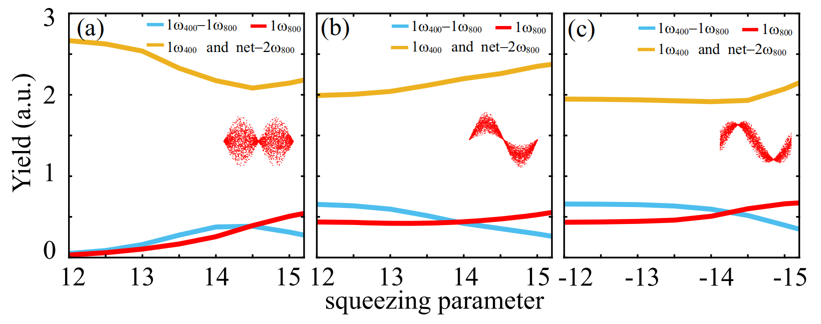 随后,研究人员进一步研究了竖直偏振的800 nm量子光分别在相位压缩相干态和振幅压缩相干态下,得到的质子动量分布,分别如图2a和2b,结果表明量子光场的压缩性质对分子解离过程有重要影响。此外,研究人员还系统分析了这几种不同量子态下,压缩度对不同解离通道产率的调控,如图3所示。结果表明,压缩度作为一个可调参数可实现对解离通道的选择性控制。光场的量子涨落显著调制了各解离通道的相对产率,并且不同光场的调制各不相同,在真空压缩态下(图3a),随着压缩度增加,不同解离通道之间出现动态竞争,导致1ω400-1ω800通道的产率呈现“先升后降”的非单调变化;而在对于振幅压缩相干态(图3c),只有在压缩度足够大时才会打破固定振幅近似(r<-13.5),引发产率的变化。这些发现揭示了一种全新的量子调控机制,展示了通过调节光的量子特性,以操控分子解离过程的可能性,为在量子层面引导光化学反应路径提供了全新的研究手段。